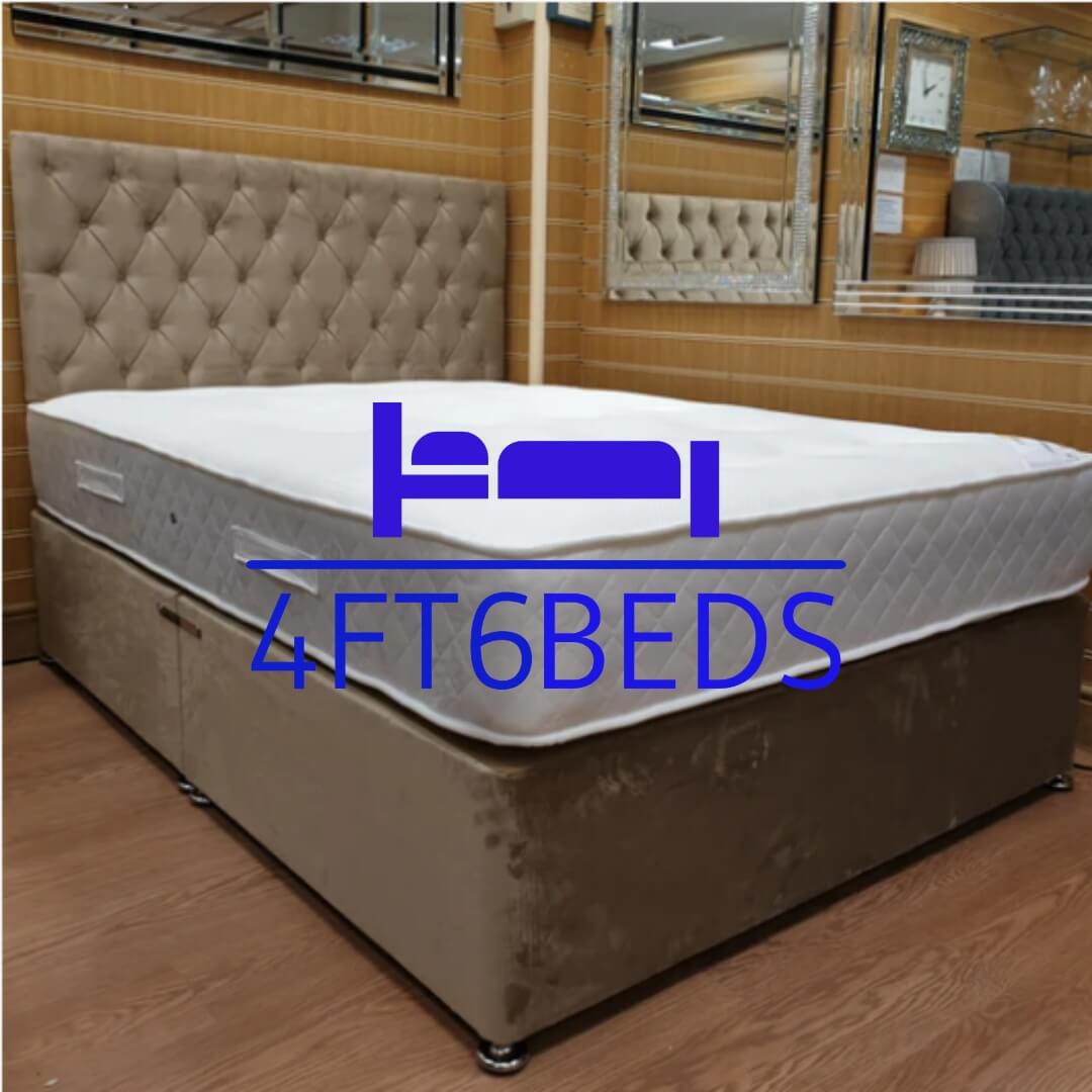 Add glam to any bedroom with a traditional divan bed finished with a tall 54″ deep padded diamante encrusted chesterfield headboard.