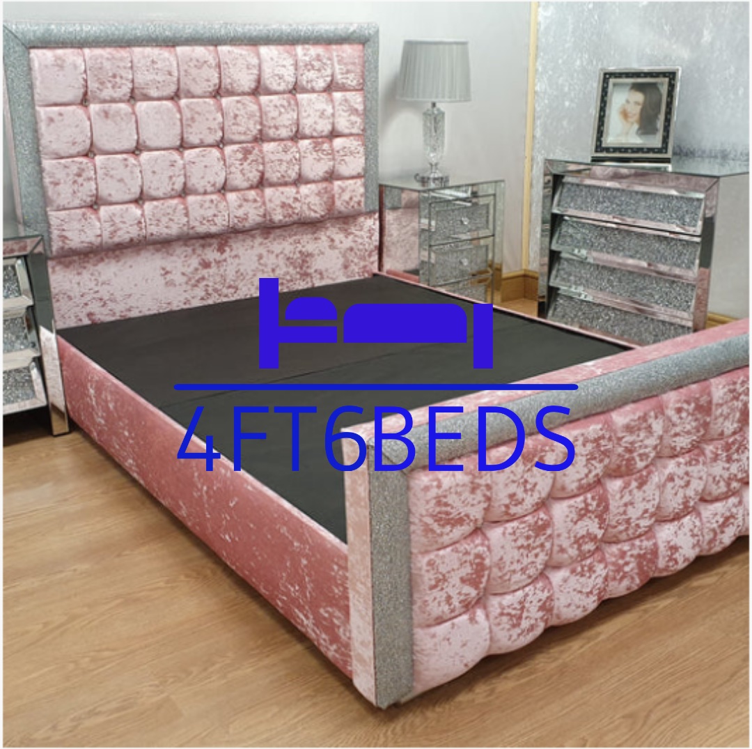 The Lexi Glitter Frame Bed. A luxury handcrafted bed. Supplied with framed boards for extra strength rather than individual slats that allows seasonal storage. For your daily storage needs the ottoman gas lift up option can be added.